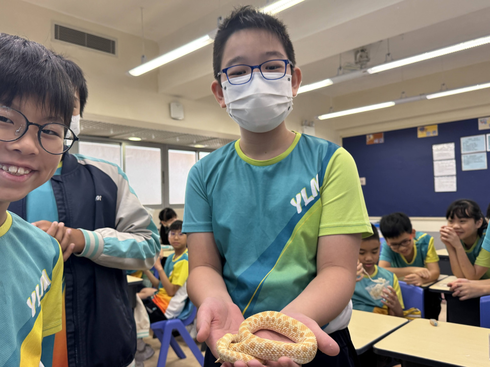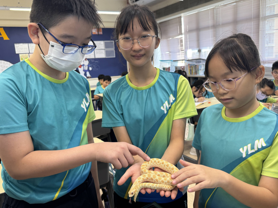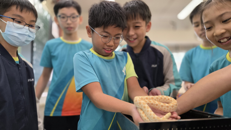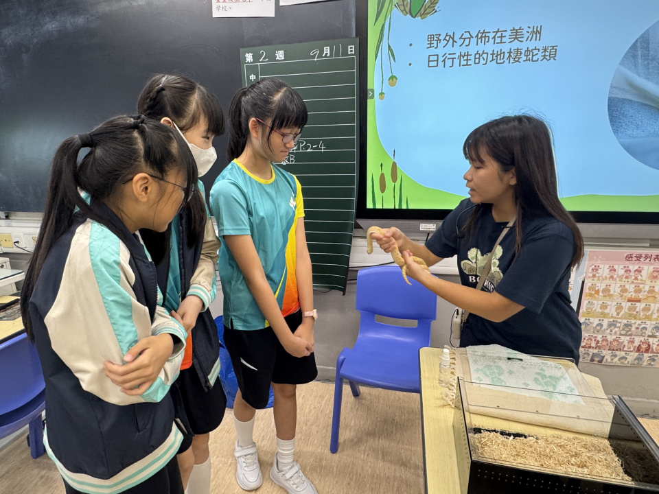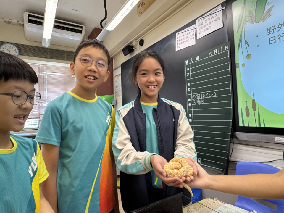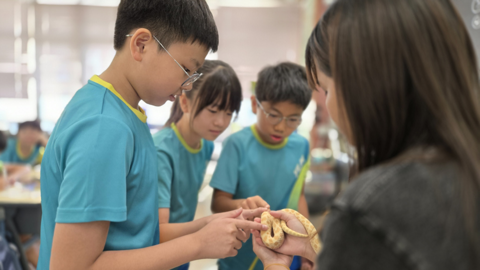 同學表現雀躍,主動抱蛇觀察!透過分組研習本地生態,將科學知識結合愛護動物的價值觀,實踐真正的體驗式學習。